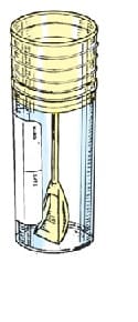 STERILE. Sterile polystyrene feces container with spoon, label and press-on cap.